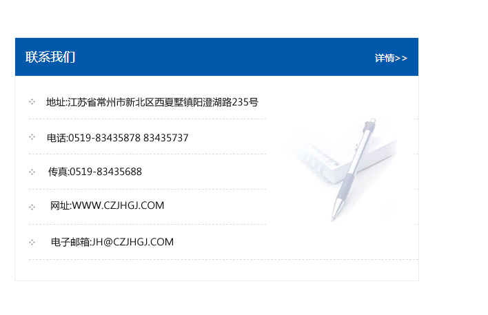 地址:常州市新北區友邦商務大廈1幢16、17層  電話:0519-85101652  傳真:0519-85112595  郵編:213022  網址:www_cz-jiayue_cn.mdjetr.com  郵箱:xiajifengaa@163.com